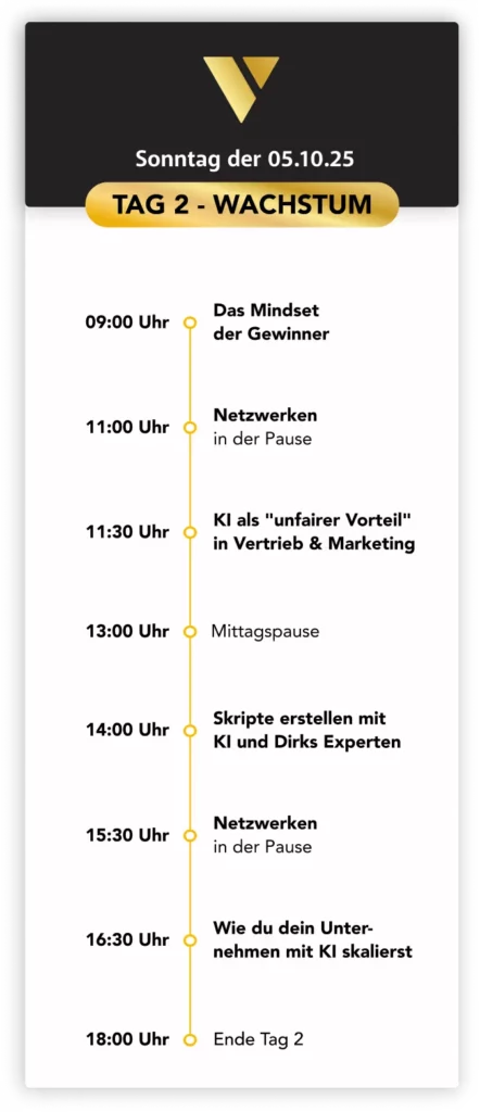 Gemeinsam mit Dirk erarbeitest du live vor Ort sofort anwendbare Vertriebswerkzeuge mit KI für effizienteste Skalierung deiner Kundengewinnung. Plus: Dirk stellt für dich erstmalig auf einem Event aktiv Kontakt zu interessierten Neukunden, Geschäftspartnern und Mitarbeitern her.